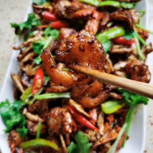 放入小米辣,青椒,再加一勺水炒到每块虾蟹都能均匀裹上酱汁