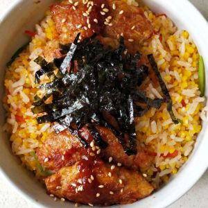 把煎好的素鳗鱼摆在提前炒好的饭上,淋上酱汁撒点白芝麻点缀