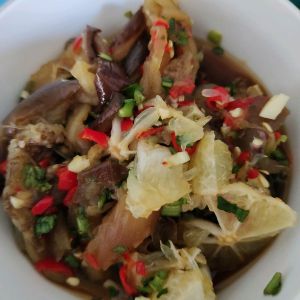 准备好茄子小米辣大蒜老缅芫荽柠檬洗净