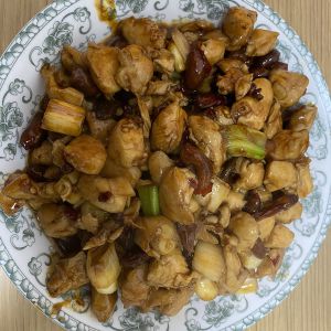 放入花生米和葱然后倒入准备好的调料翻炒熟