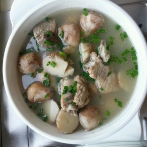 准备小砂锅一只,加半锅水用大火烧开。水开后加入虑干水份的仔排,加香叶粉少许,小火慢炖1个半小时左右,再倒入芋艿仔,加适量盐小火再炖半小时,撒入葱花关火,盖上盖子再焖2~3分钟。打开盖子……那个味道……不说了,你自己试试就知道了!