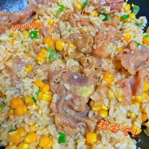 开火后锅中放入一碗剩米饭,沿着锅边放入肥牛片,接着放上一块黄油、玉米粒和葱花。