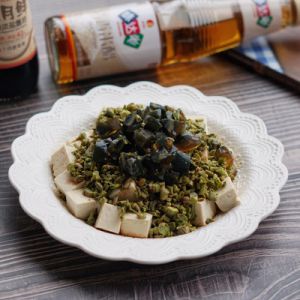 用一个盘子把豆腐,香椿,皮蛋依次摆好