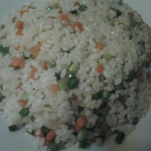 3.锅内食材快熟时放入米饭(最好是在冰箱里冷藏过的剩饭),加入适量盐,白糖。炒匀即可出锅。出锅前撒些葱花会更好吃。