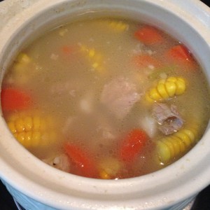 小火炖煮四十分钟左右下入玉米胡萝卜和山药,中火煮开转小火再炖大约四十分钟。(为了鲜香浓郁的汤,要有耐心哟^ ^)