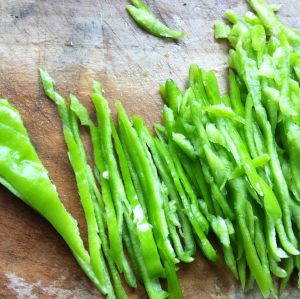 尖椒洗净用刀背拍扁,斜切成长丝。