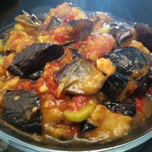 加入茄子翻炒至软烂 ,加入黄瓜片,收汁儿。