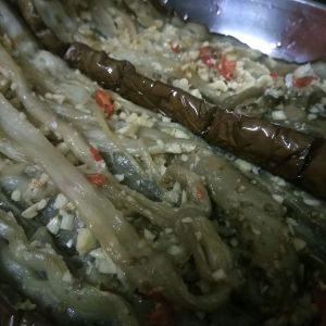 茄子烤好后用刀在中间划开,然后弄成图中的样子。放进蒜末剁椒后,均匀铺开,可以撒上适量椒盐也可不加。最后放进烤箱,上下火230度,20分钟
