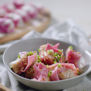 渐变色面皮——取500g面粉,160ml水,一个鸡蛋,5g盐放入搅拌盆,搅拌制得白色面团;取250g面粉,110ml火龙果汁,2.5g盐放入搅拌盆,搅拌制得红色面团。