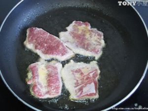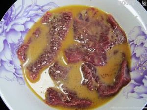 将牛肉切成薄片,不要太厚。用刀背不断地捶牛肉,也可以用擀面杖捶打,当然多捶几下更好啊。在牛肉上放生粉,蛋清,葡萄酒,鸡精和十三香搅拌腌制20分钟。