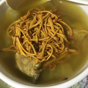 炖至2小时后放入虫草花(也可以不放,我是喜欢吃这个,而且汤的颜色会变得金黄;不喜欢的朋友可以不放)