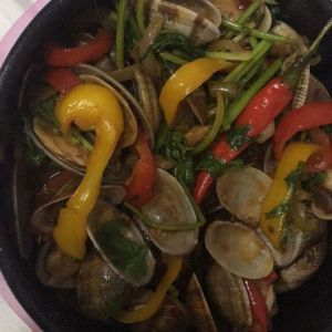 锅里放油炒花蛤至有白色鲜汁花蛤微张口