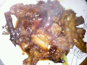 倒入适量的油,放入干红椒再放入葱姜蒜煸炒,继而放入排骨, 倒入适量的生抽和老抽,稍微加些香醋,