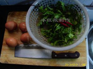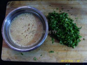 将辣椒皮除去辣筋,用刀切碎与加入料酒的蛋调匀。