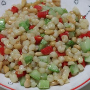 准备好农家玉米两根,煮七成熟剥下颗粒待用。胡萝卜切丁沥水待用。黄瓜切丁。松子剥好。