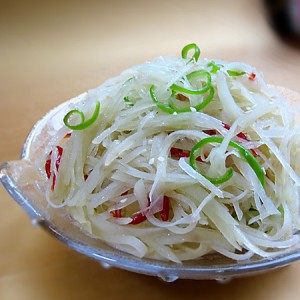 将快速焯水(约10秒)后的土豆丝入凉白开浸凉备用~