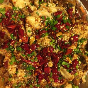 鱼骨炸脆捞出,放入盘中,锅留底油放入八角、姜容、蒜蓉、葱白炒香,入水煮鱼调味料,加入适量开水,放入少许盐和白糖调味,煮沸后放入鱼片,用勺背轻轻的推动一下,消微的煮一下肉质变白就好,连汤一起倒出,撒上葱花。