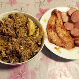 事先把酱油倒在隔夜米饭里搅和一下,然后炒完鸡蛋的锅重新倒油把米饭放里翻炒。在加些葱花提味儿,最后收锅。