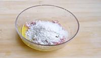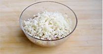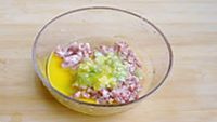 猪肉馅倒入大碗,放姜末、葱末、盐、鸡蛋,顺同一方向搅打上劲