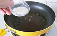 锅中留底油,倒入红葡萄酒、蚝油调匀,勾薄芡出锅浇在藕饼上