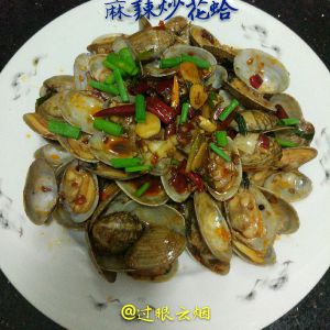 入花蛤翻炒,调入生抽,糖,胡椒粉,味精快速翻炒均匀,淋芝麻辣椒油关火。