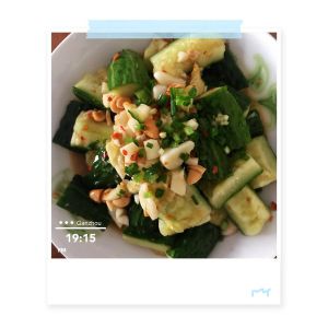 黄瓜块装入大碗,撒上花生碎,生抽、陈醋、葱花;辣椒粉,少许盐,最后浇上烧热得花生油,香味儿来了,拌一拌就好了……