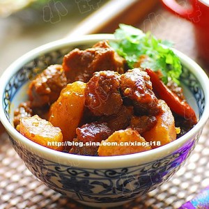 当牛腩烧至软烂后,将炒好的土豆加入牛腩锅中,继续焖10-20分钟