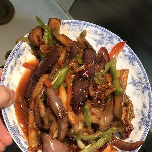 完了就下蒸好的茄子,翻炒,再放辣椒,放点生抽和蚝油。这样比较香。出锅前放几滴醋就完美了。一定是出锅前,放几滴就好不要搁太多。炒的时候也可以放点糖提味儿
