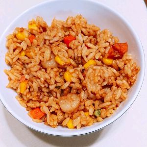 火腿肠炒热后倒杂蔬菜(超市有卖,一包里有虾仁和杂蔬菜两种),炒2-3分钟后倒虾仁,然后倒泡好的米饭不断翻炒。