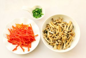 将杏鲍菇放入淡盐水中浸泡10分钟后,切小条;红椒去蒂去籽洗净切丝,葱姜切小段。