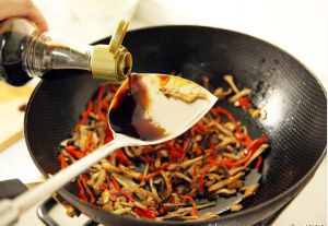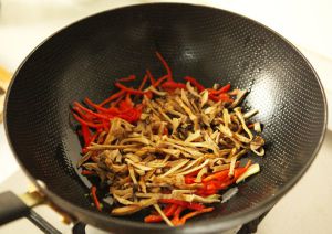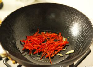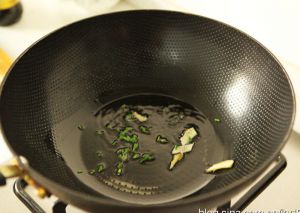 锅热后放少许底油,油热后下葱姜丝炒香。