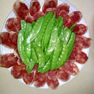 把炒好的荷兰豆,摆放在装好腊肠的盘子里