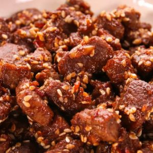 出锅前撒点炒香的白芝麻,香喷喷的牛肉干就新鲜热辣出炉咯。