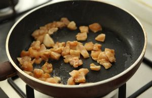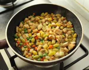 快速煽炒至鸡肉变色。