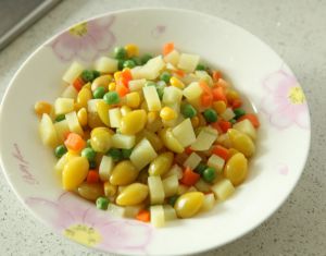调入半匙盐,将土豆和杂菜焯熟。