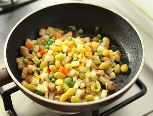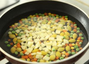 倒入土豆和杂菜,翻炒数下。