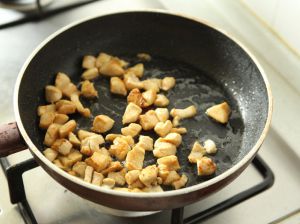 锅中少许油,7分热,倒入鸡丁。