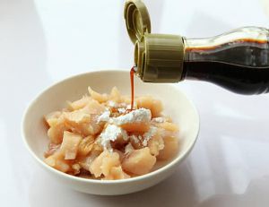 鸡胸肉洗净沥干后切成丁放入小碗中。