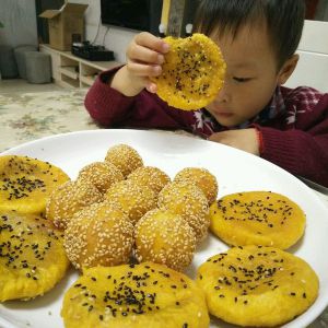 把和好的面团平均分成几个等分!首先我做几个南瓜饼!每等分都用手搓好再压扁!中间包些蒸熟后的紫薯泥!捏拢再搓圆后用手按压成饼狀再两面撒些黑芝麻!有面包糠的可以撒面包糠!