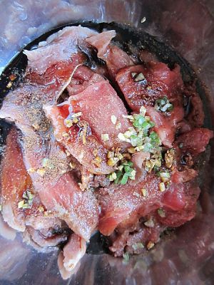将葱、姜末放到肉片中,加入五香粉、孜然粉、胡椒粉、老抽、味达美、料酒、盐;