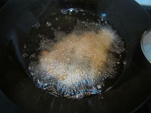 将炸好的肉都放入锅中复炸片刻;