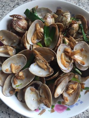 准备蒜苗段,辣椒碎,热锅,放油,放辣椒。煸炒出辣椒香,放入花甲,翻炒几分钟,放入生抽,盐,再翻炒一会儿,放入蒜苗,翻炒几次,出国。