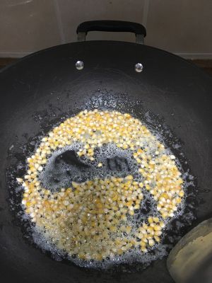 将玉米倒入锅中,中火加热,不停滴搅拌。听到有玉米“砰”爆的声音,盖上锅盖,不停滴摇晃,直到没有声音为止,关火。开盖,品尝一个,觉得不甜可以乘热加点白砂糖,搅拌均匀即可。
