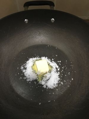 将黄油和白砂糖倒入锅中,小火加热。