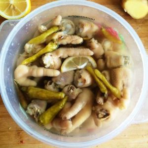 洗干净后放入一碗清水 加入泡椒水和泡椒 放10g白酒 10g白醋 柠檬可加可不加