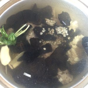 取一砂锅,把排骨,薏米,黑木耳放进砂锅内,加入料酒,开水,葱与姜,烧开后转小火慢炖1个半小时。