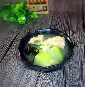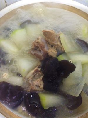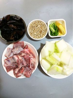 排骨用温水洗干净,冬瓜去皮冲洗干净切片,木耳与薏米仁提前两小时泡发。