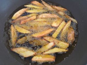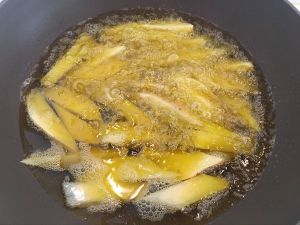 小火慢炸,土豆条在油锅里会翻滚着小泡泡,这里土豆里带的水分。