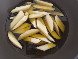 锅里倒入植物油,冷油倒入土豆条。这样冷油下锅土豆在炸制的过程中不会油星四溅。