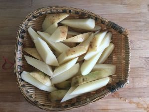 土豆清洗干净后带皮切成大的土豆条,然后将土豆条在清水里冲洗一下。